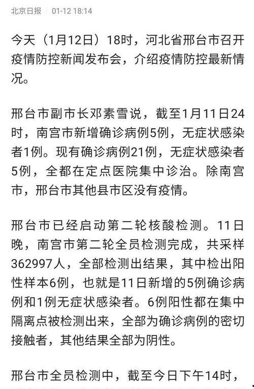 亲爱的邢台市民们,最近有没有关注到我们城市的疫情动态呢?今天,就让我来给你带来最新、最全的邢台疫情消息,让我们一起了解这场战“疫”的最新进展。